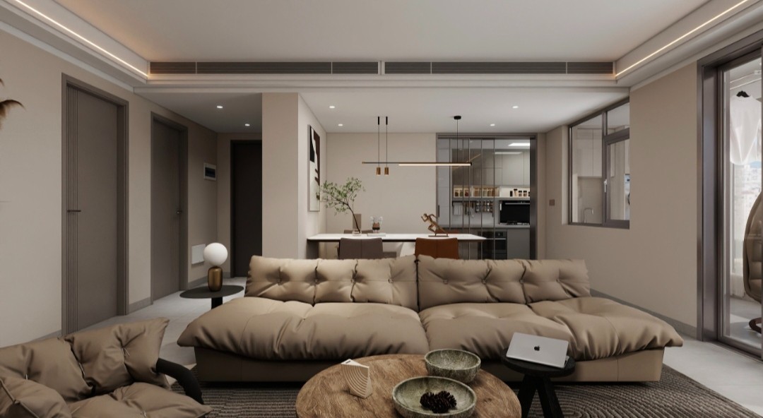 客厅设计注重线条的设计,注重空间的留白与整洁感,整体突出了功能性的设计形式,顶面采用无主灯的设计去进行氛围性的营造。