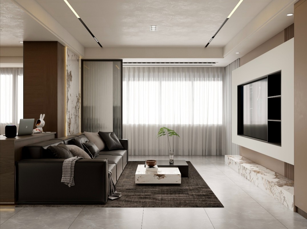 客厅以黑白灰+原木色调为主,整体空间通透明亮。