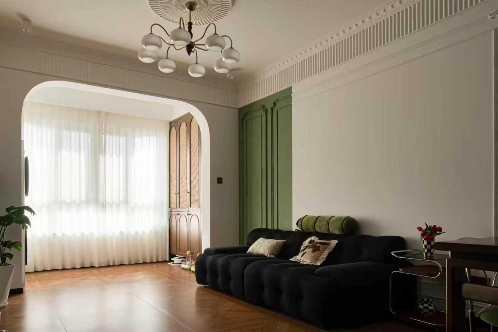 墨绿色与白色墙面搭配,结合复古造型的吊灯和黑色沙发,营造出复古而时尚的氛围。拱形门洞设计增添空间层次感,阳光透过纱帘洒入,营造出舒适惬意的休闲社交空间
