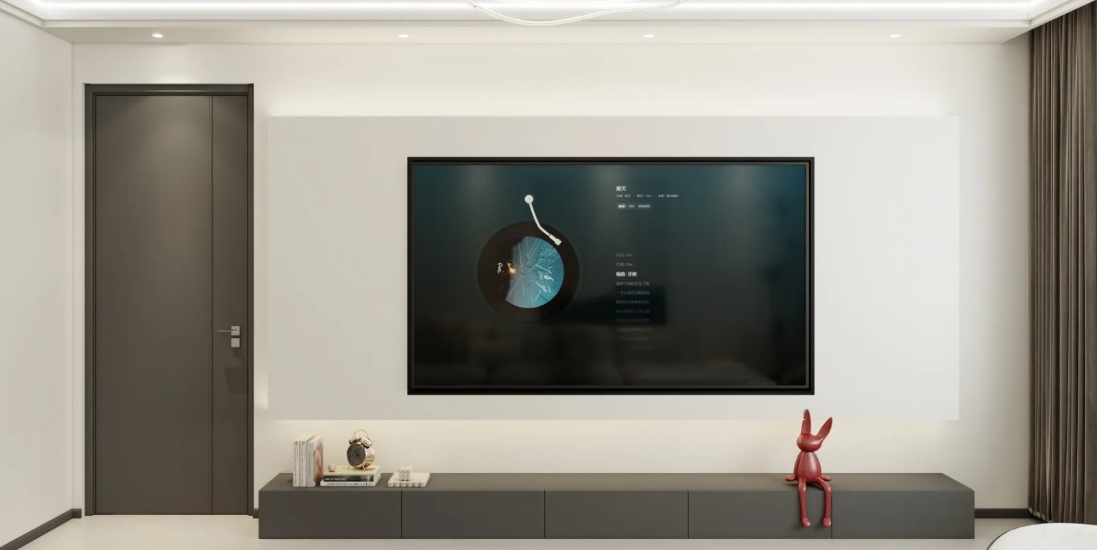 墙面以白色为主,搭配深色木质门,形成鲜明对比。中央悬挂一台大屏幕电视,下方是简洁的灰色电视柜,上面摆放着几本书和一个红***雕塑,增添了趣味性。整体设计简洁大方,功能性强,适合现代家庭的娱乐需求。