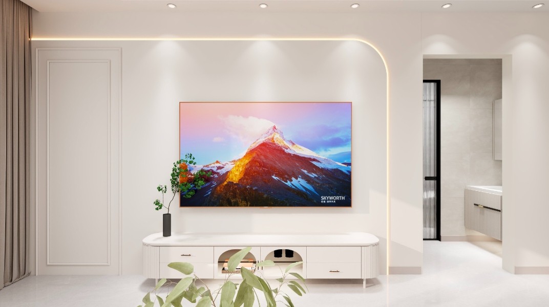 客厅奶白色调为主的空间营造出清新、明亮的氛围,搭配弧形元素背景墙则增加了整个空间的柔和感与流畅感,让人感到宁静和舒适。