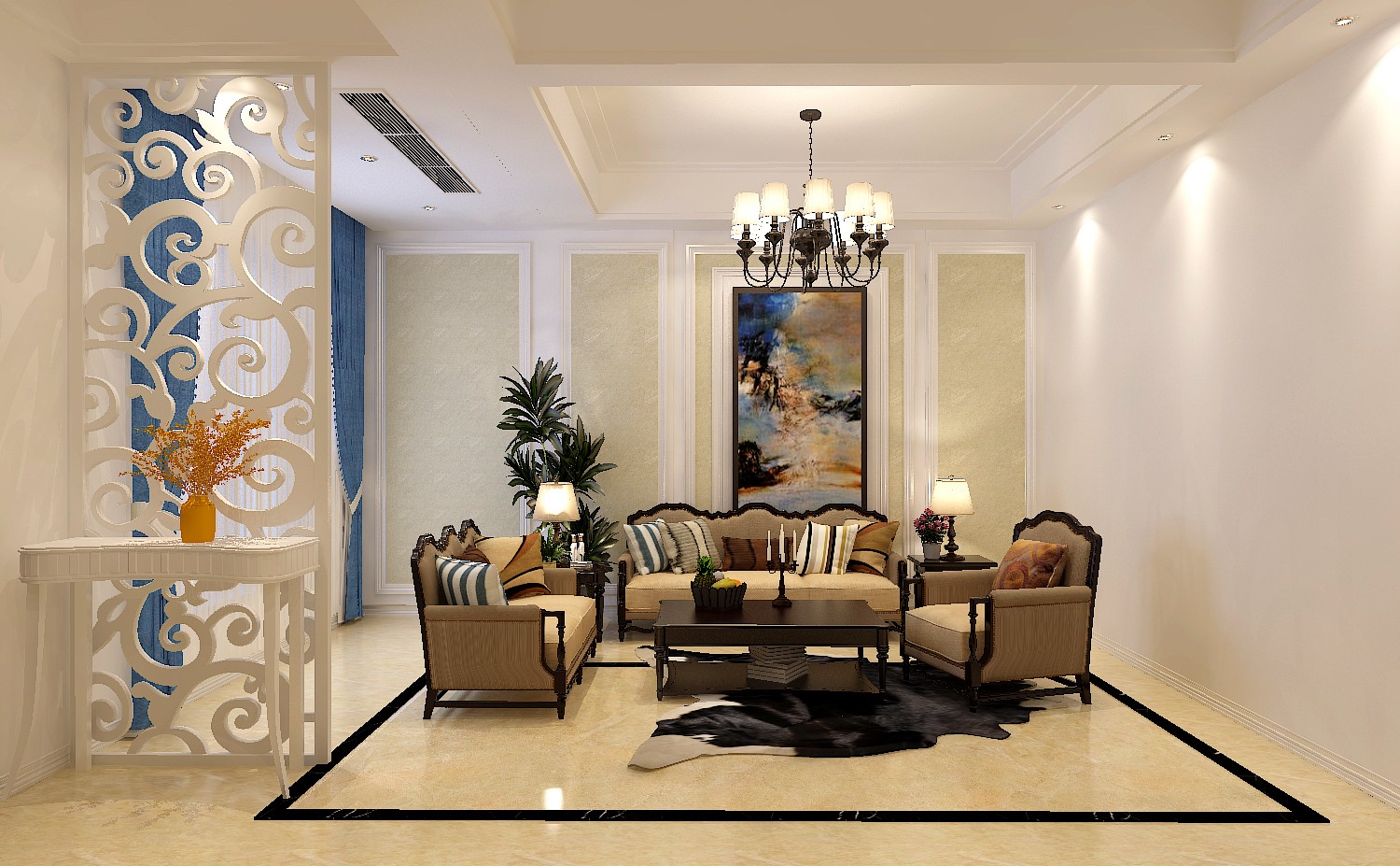 进门是大客厅,摆放了传统的布艺沙发,与大理石纹理的瓷砖搭配,恰到好处