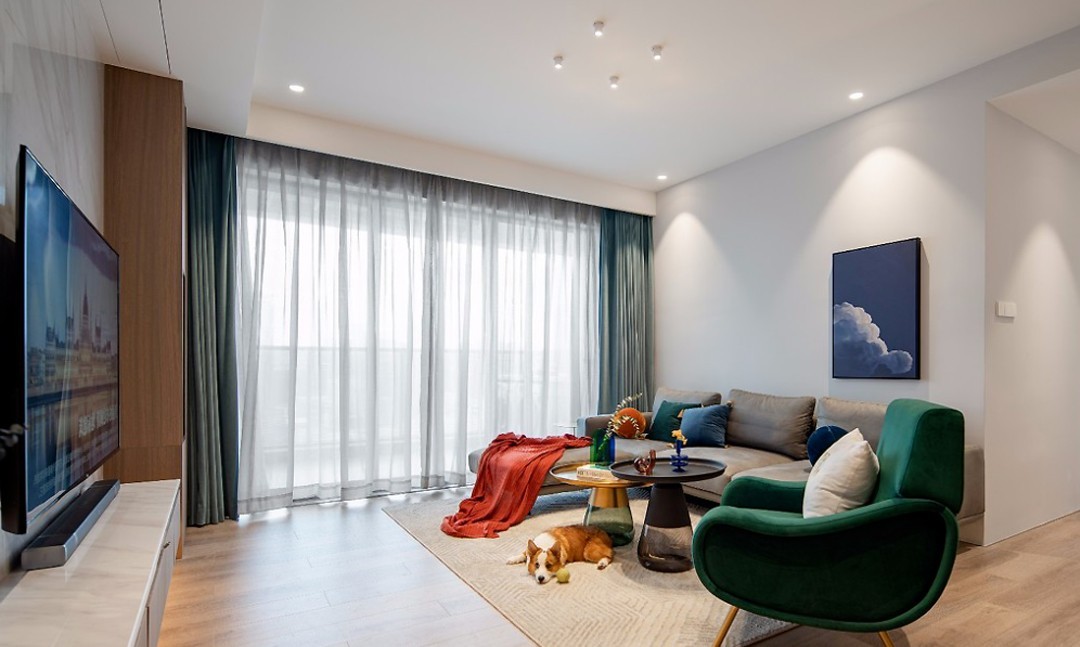 蓝绿红的抱枕与饰品、金色玻璃拼接茶几、异形花瓶等元素的采用,既增添色彩活力,又让客厅具备满满的设计感和新鲜度。