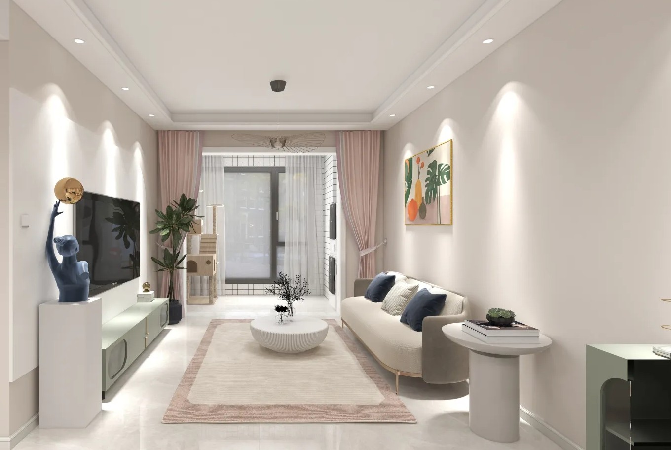 浅色调墙面搭配白色天花板,柔美温馨。电视墙设有独特摆件,沙发柔软,配多彩抱枕。绿植与艺术画增添生机,整体空间通透敞亮,尽显舒适惬意。