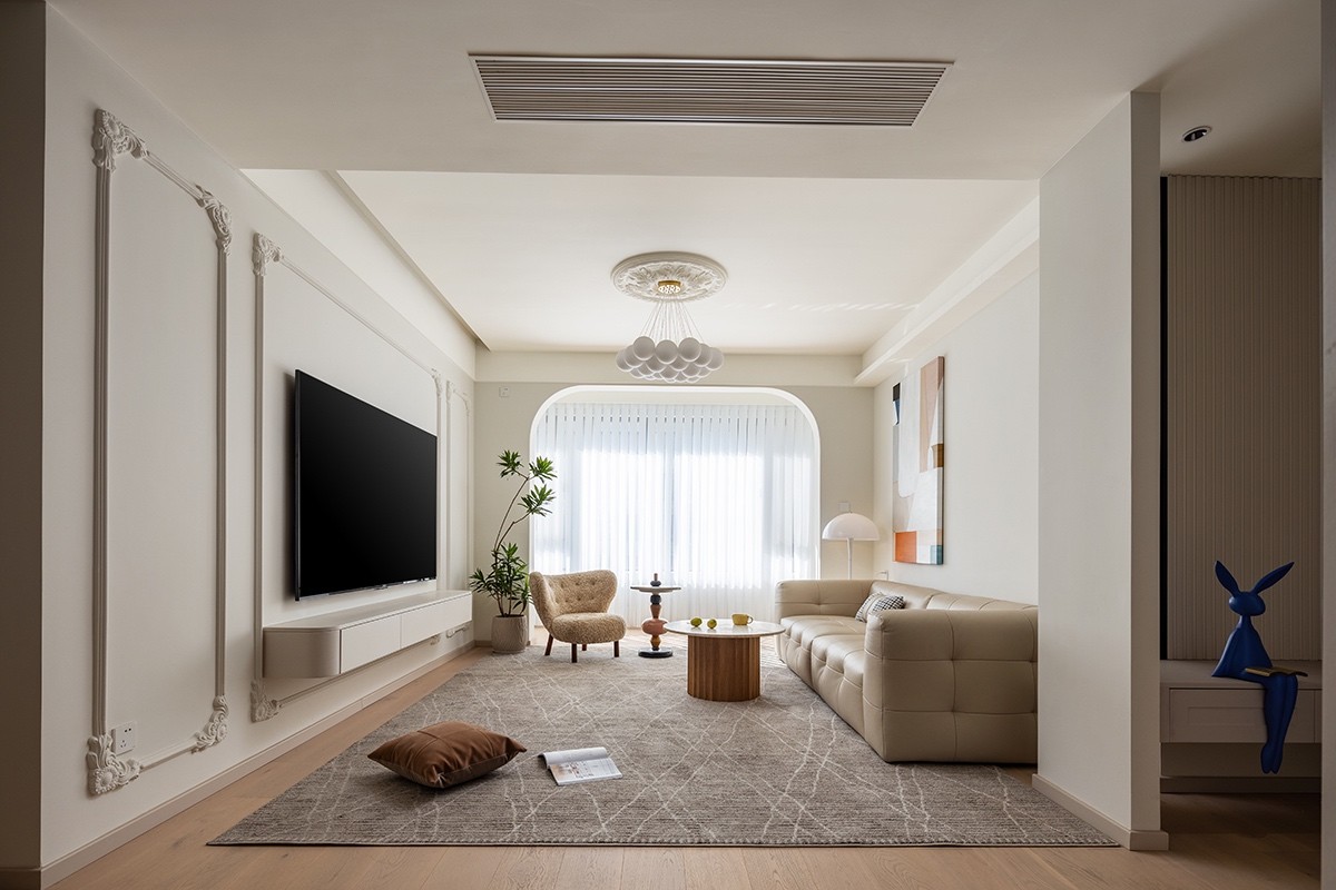 石膏线条给予墙面立体感,从完整的空间系统中凝聚出具体的空间体验,带来可视化的感染力。 卧室软装代替繁杂的基装造型,用多元化形态打造感性、趣味的居所秩序。