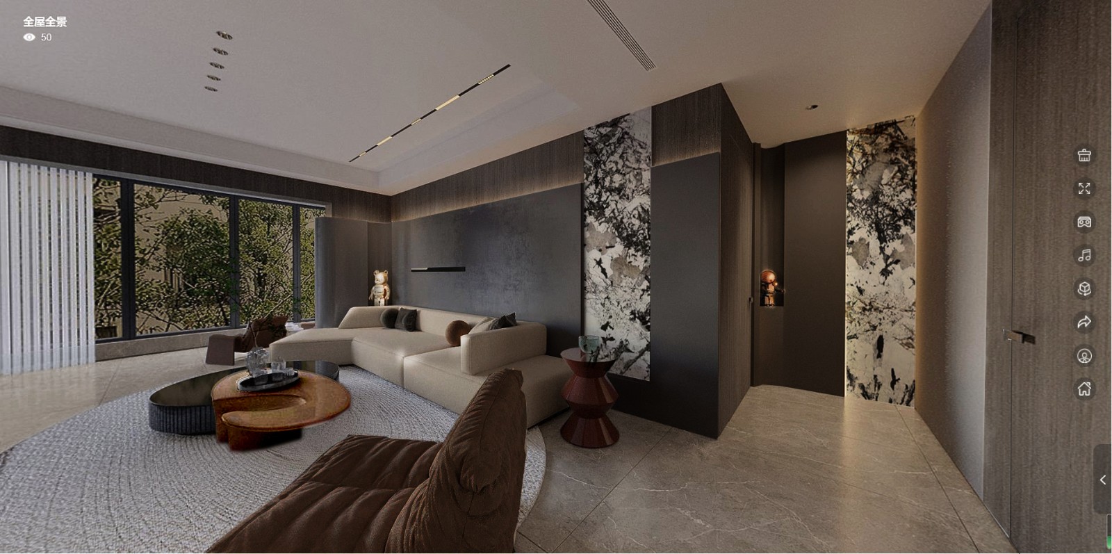 作为地产样板间,目的为提升楼板品质的同时,客户来带样板间也要让人产生无限的遐想及购买欲,采用柔光石纹地砖,墙面木挂板与岩板搭配,在动线出现锐角区时,我们设计采用弧形来弱化,整体的调性偏暖灰,美拉德色系,带有意式轻奢感。