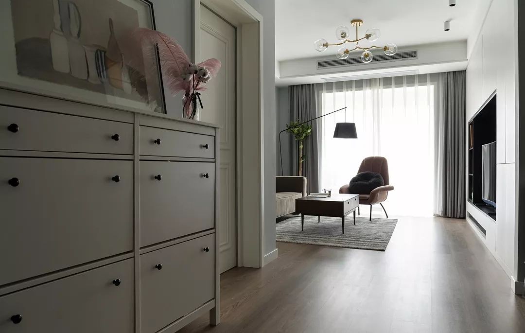 进门左侧设置小矮柜作为简易鞋柜与端景台,摆放装饰画与轻盈的粉色羽毛摆件,