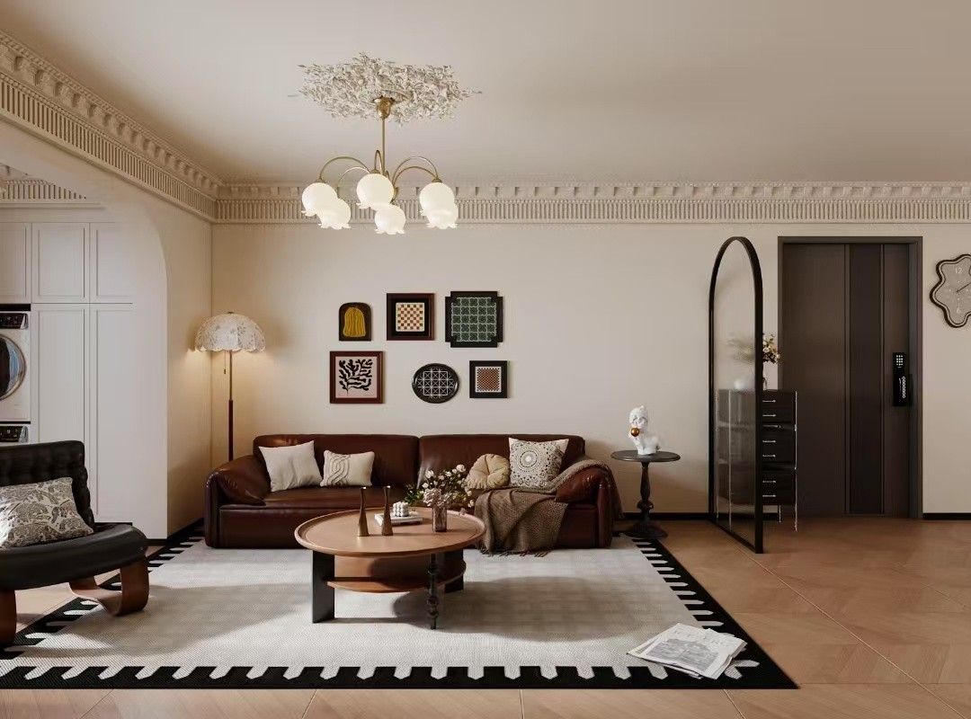 以棕色皮质沙发为核心,搭配圆形木质茶几,营造复古温馨氛围。落地灯与小边桌增添精致感,背景墙装饰画与花纹吊顶相呼应,华丽吊灯居中点亮空间,展现复古格调。