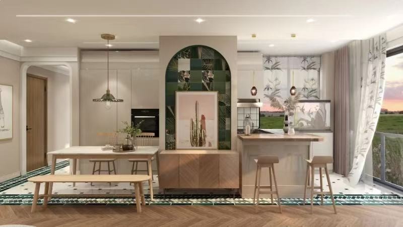 本次设计业主是一位艺术气息浓郁的版画师小姐姐。要求:复古+文艺+北欧+小清新。进门墨绿色花砖点缀,视觉上将空间规整划一。打掉原本厨房墙面结合入户花园做开放式厨房让空间更通透,增加空间使用率。整体色调以莫兰迪为主营造清新文艺感。这样小众的混搭你们喜欢吗?