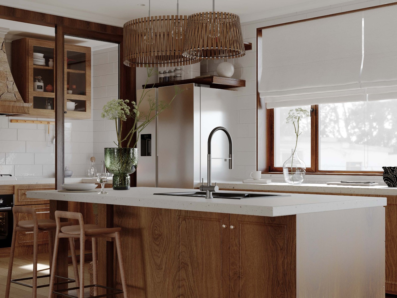 左侧开放式储物架,木质的,里面摆着碗碟和瓶子,既实用又展示装饰。旁边白色砖墙让空间更明亮,和木质元素形成对比。天花板的竹编吊灯很有特色,自然材质带来温暖氛围,和整体风格协调。 再检查细节,比如水龙头是现代设计,中岛台下方的柜子有把手,高脚椅木质座椅和金属腿结合。整个厨房色调以木色、白色、不锈钢色为主,营造出舒适又时尚的感觉,自然与现代融合,适合日常使用和放松。