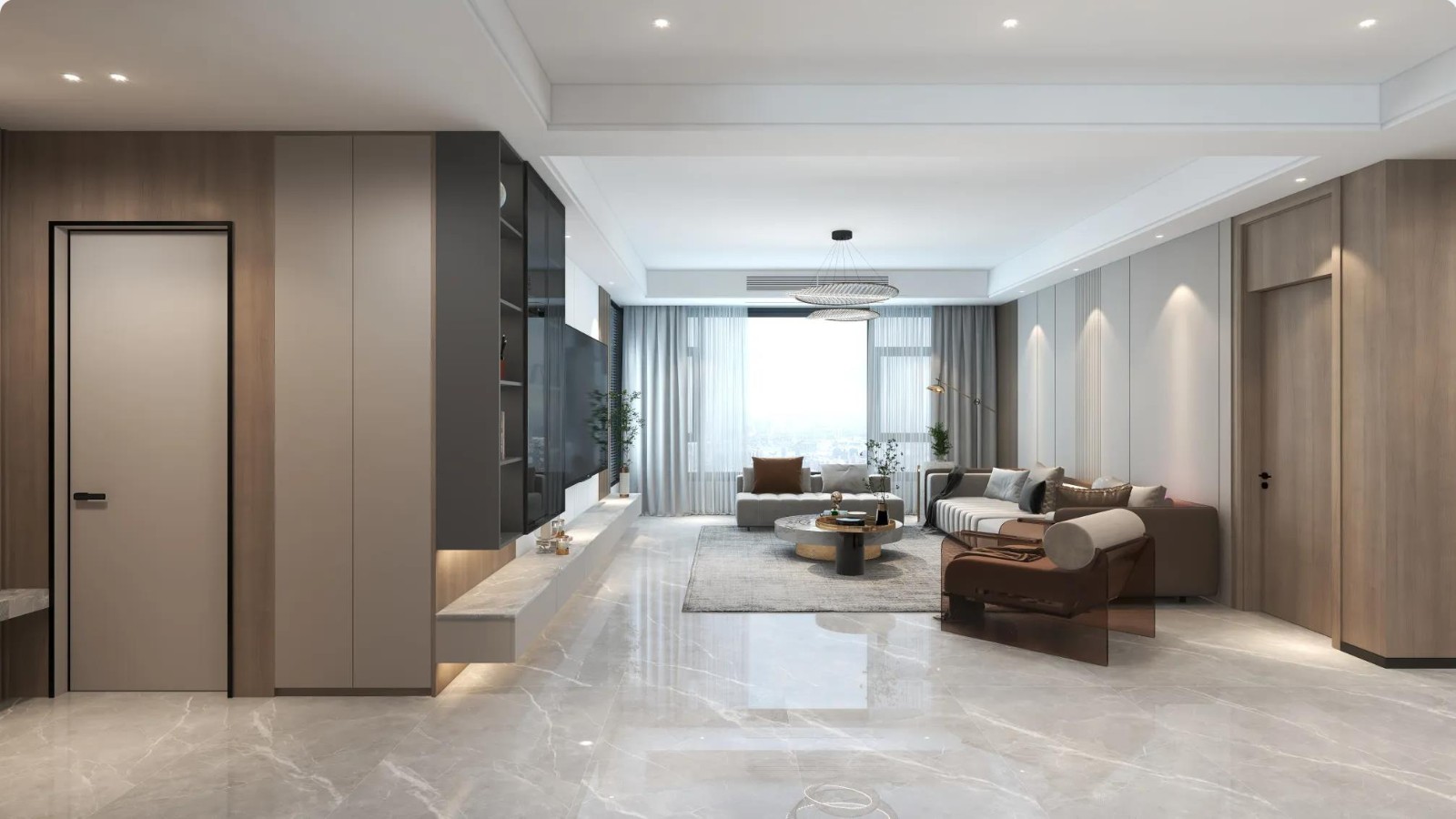 这是现代简约风格客厅,以中性色调为主。浅木色与灰色柜体结合,电视墙设计简洁又具收纳功能。地面是浅灰色大理石瓷砖,质感***。沙发组合搭配柔软抱枕,款式简约时尚。圆形茶几精致,金属与大理石材质增添轻奢感。简约吊灯与筒灯组合,提供充足照明,营造出舒适且时尚的居住氛围。