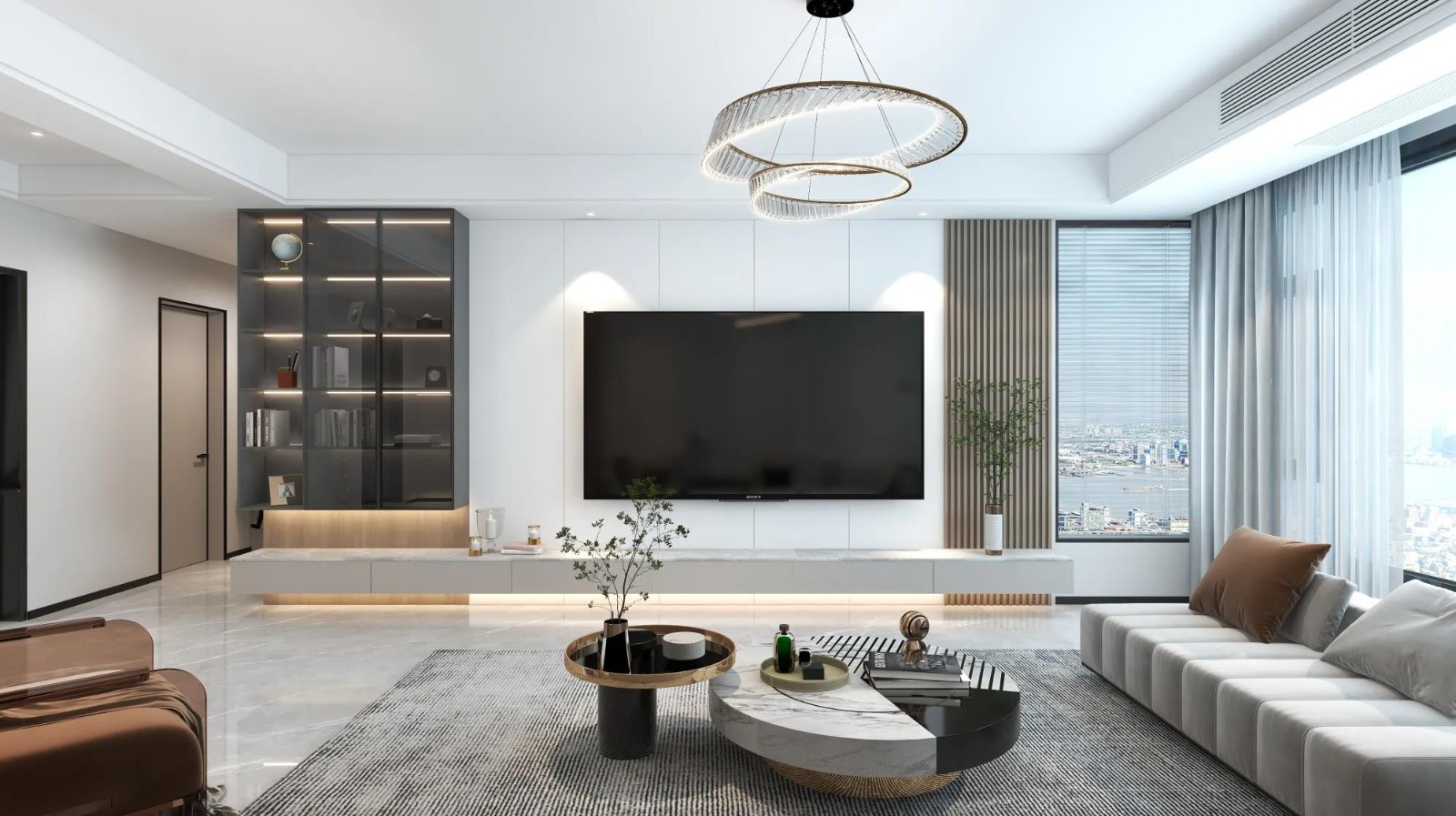 现代简约风格,以白色为主调,搭配浅木色与金属元素。电视墙采用白色岩板搭配黑色玻璃收纳柜,内置灯带,时尚且实用。无主灯结合环形吊灯,营造温馨氛围。沙发、茶几简约时尚,绿植点缀增添生机。