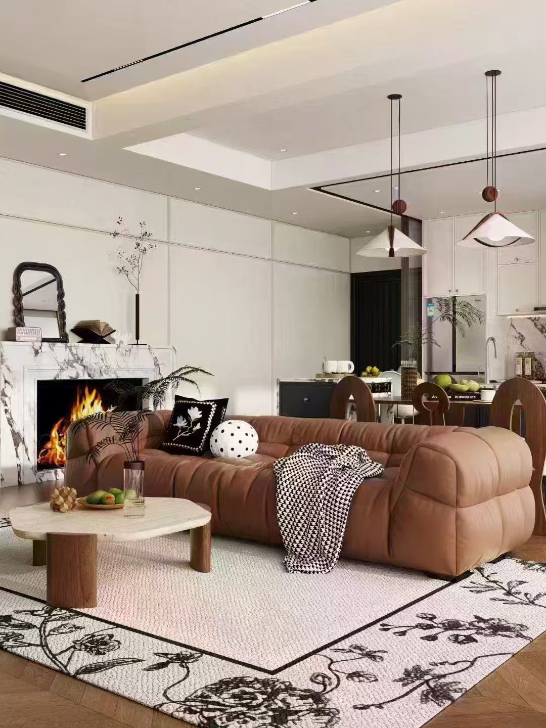 新风系统,岩板岛台暖色系搭配棕色沙发
