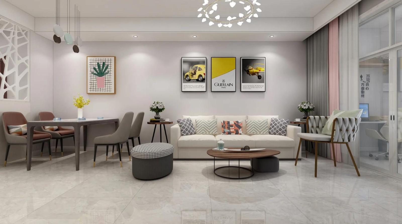 浅色系墙面配装饰画,简约平顶吊顶,内嵌筒灯并搭配造型吊灯。地面铺浅灰瓷砖,浅色沙发配多彩抱枕,茶几、边几点缀,营造舒适温馨氛围。