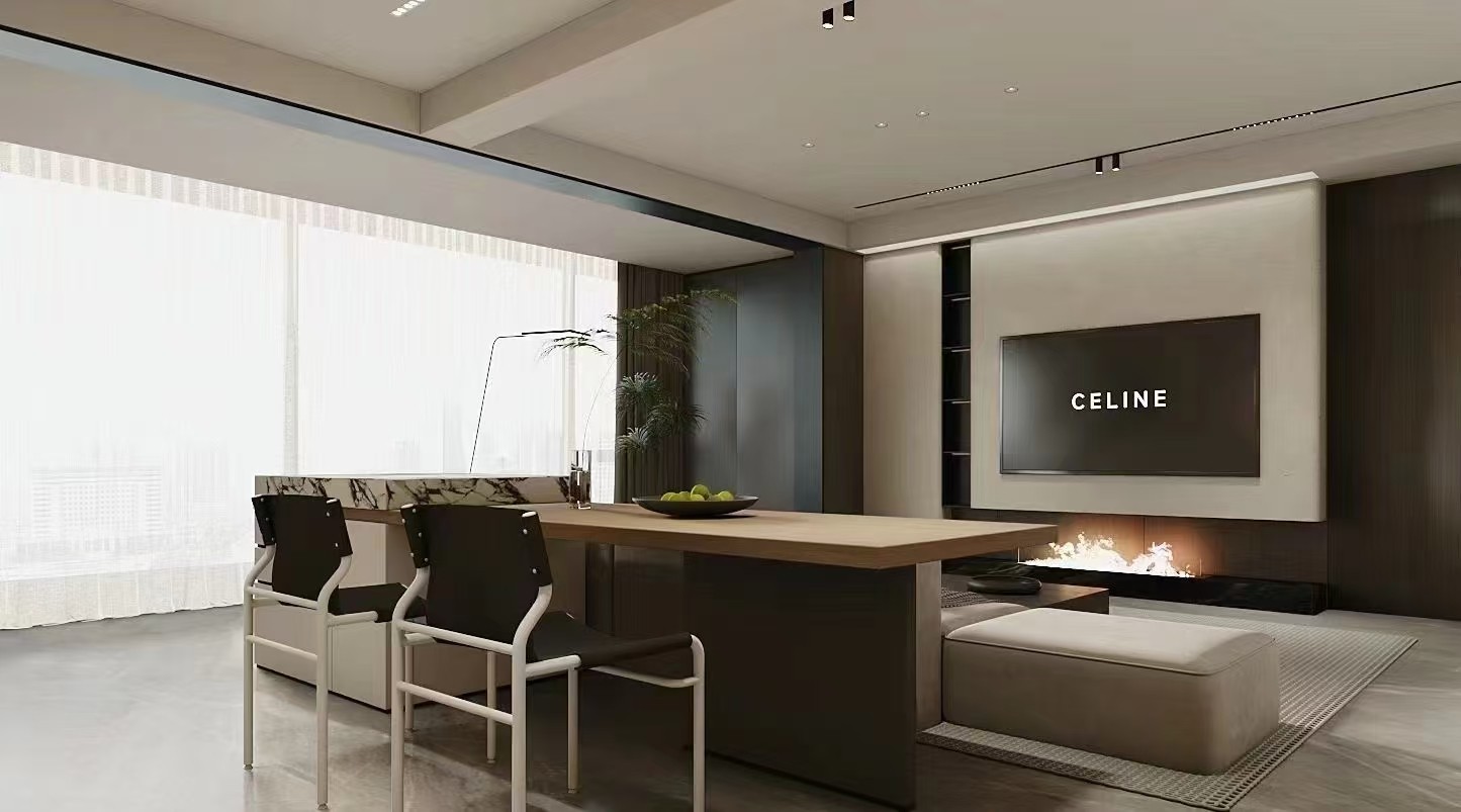 胡桃木和黑色木制品,壁炉的点缀增加空间的温暖