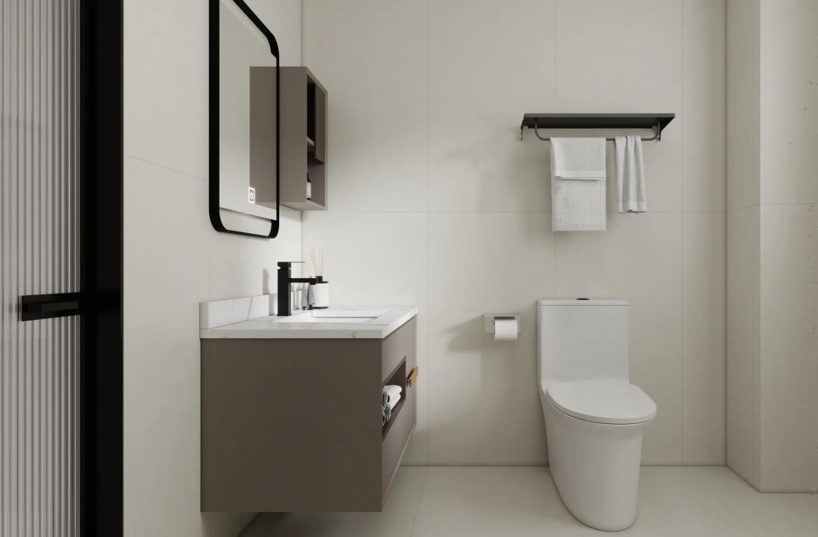 洗漱区:安装悬挂式浴室柜,柜体为深棕色搭配白色台面,简约时尚。搭配黑色水龙头与带收纳功能的镜柜,镜柜内可放置洗漱用品,保持台面整洁。 如厕区:配置白色马桶,简洁实用。上方安装黑色毛巾架,可悬挂毛巾等物品,方便日常使用。 淋浴区:采用黑色边框长虹玻璃门做干湿分离,玻璃的竖条纹设计既保证隐私又具透光性。黑色淋浴花洒套装,造型