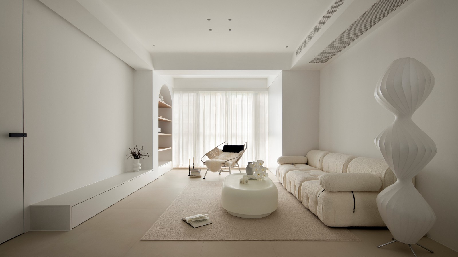以白色为主色调,墙面、天花板、家具大量运用白色,搭配浅米色地面、地毯,营造出简洁、干净且柔和的氛围;