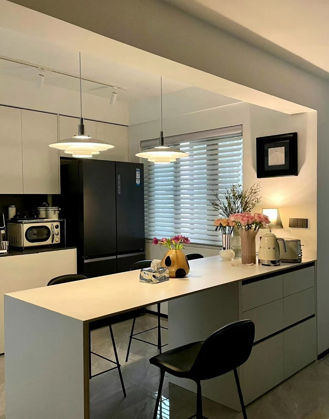 做开放式厨房,餐厨一体显大又实用。放弃传统餐桌,2.5岛台既是餐桌也是餐桌台。打通阳台连同客厅,可以拉长客厅空间。还有很重要的全屋的色彩要统一。不要轻易混搭,太容易翻车。硬装大部分为黑白灰色搭配。软装主要是浅色为主,小件的黑色点缀