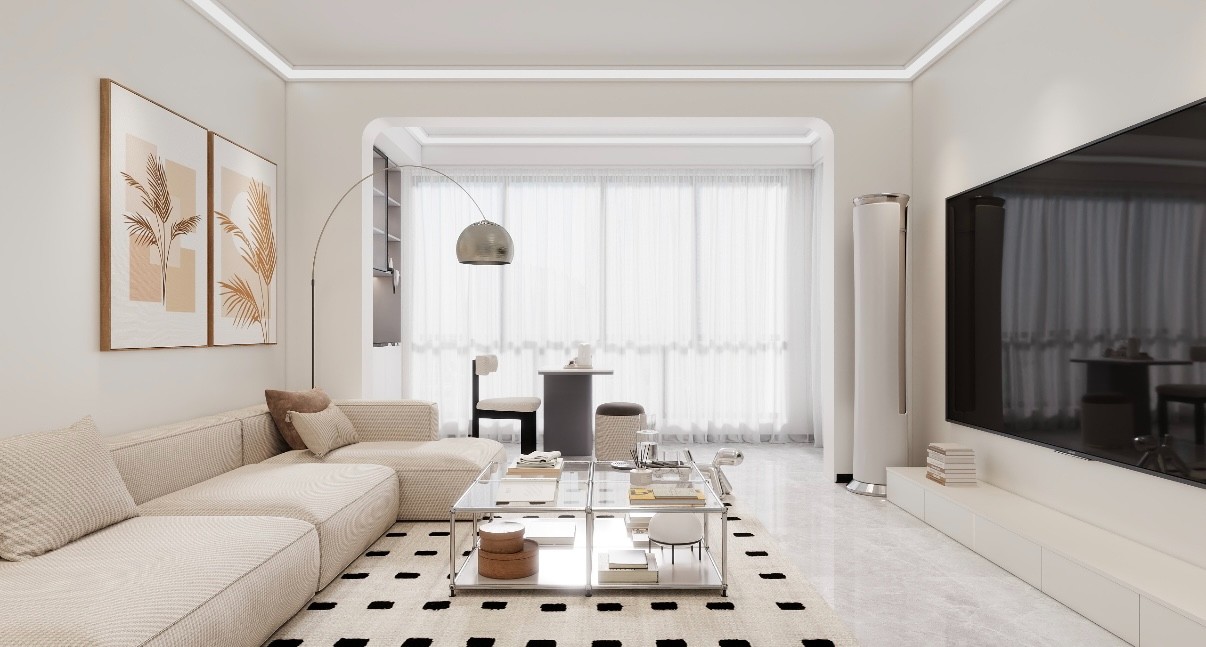 浅米沙发配纱帘,白墙木柜留白,极简布局通透舒心
