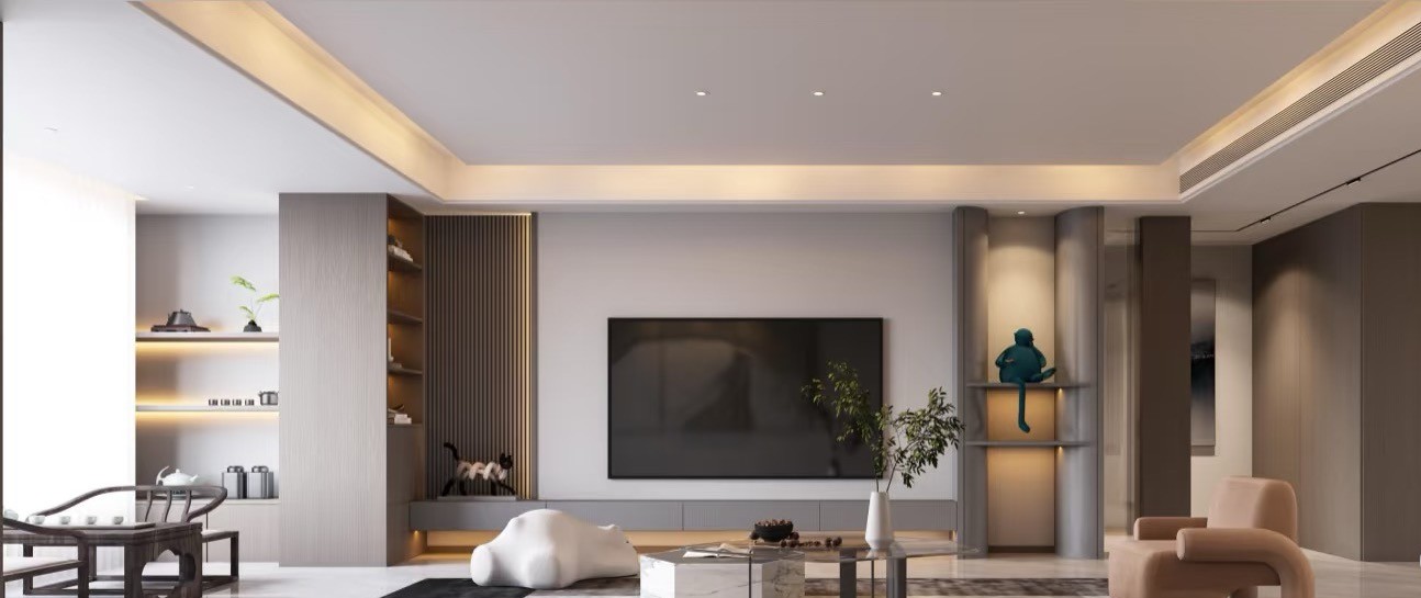 整体以灰白棕为主色调,简洁大气。电视背景墙结合格栅与收纳柜,富有层次感;无主灯设计搭配灯带,营造温馨柔和的氛围。