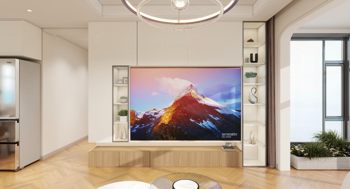 浅木电视柜配雪山画,环形吊灯置物架,简约奶油风客厅