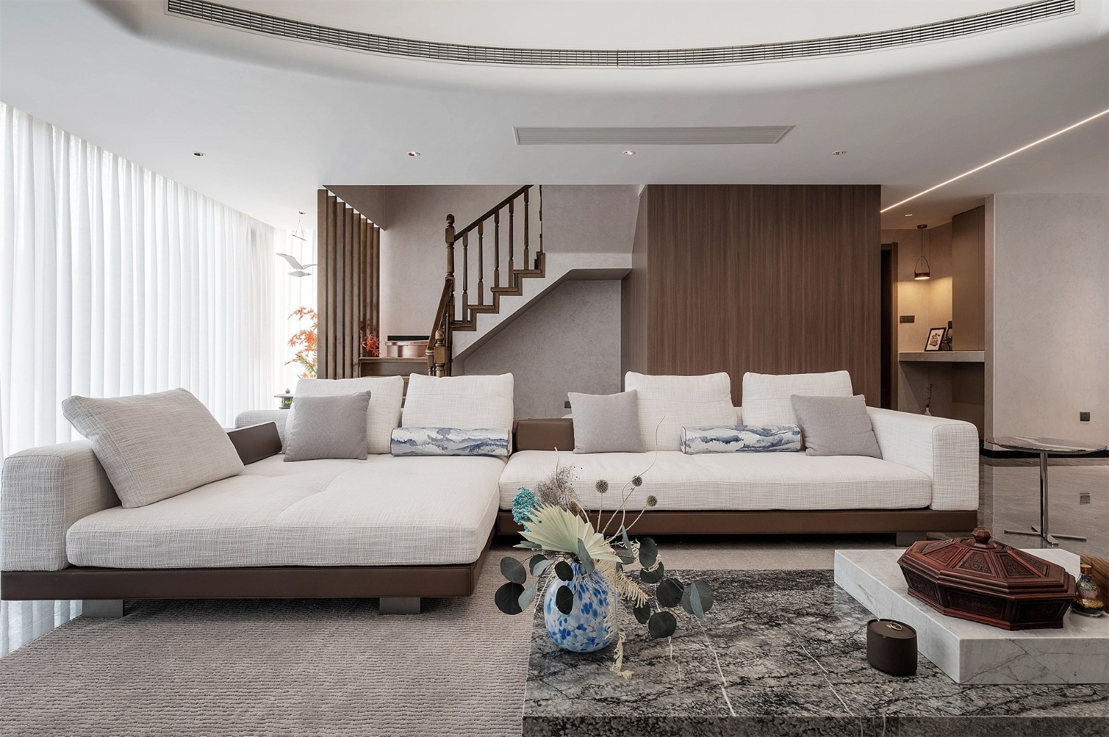 天然柚木打造的旋转楼梯栏杆,其温暖的木色与纹理为空间注入自然气息,与深色木饰面背景墙共同构成现代与古典的时空对话。 象牙白磨砂皮包裹,形成舒适的围合式休闲区。组合式茶几采用黑玛瑙与白铜的材质碰撞,其错落的造型如同现代雕塑。每个细节都经过精密推敲,共同谱写出空间艺术的完美乐章。