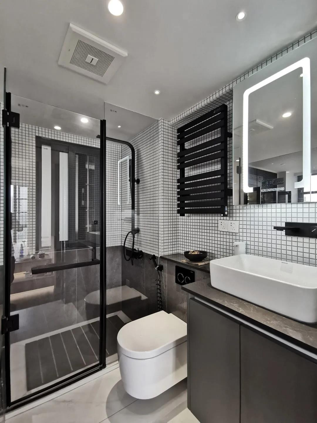 卫生间,黑色玻璃盒子设计,强化区域界线,半透明也提供视线交流的可能性,同时也让卫生间增添了一抹神秘感和情调。