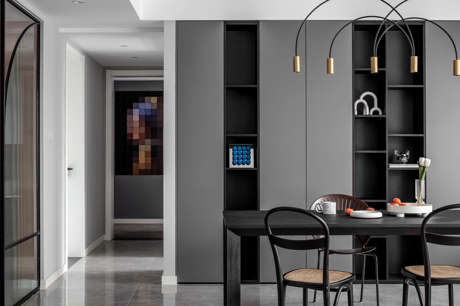 靠墙储物柜采用2:8法则,封闭与开放组合排序,可以放置各自喜爱的不同元素风格的装饰品进行展示。并且用黑色与灰色加以区分,让空间不显呆板并有层次感。