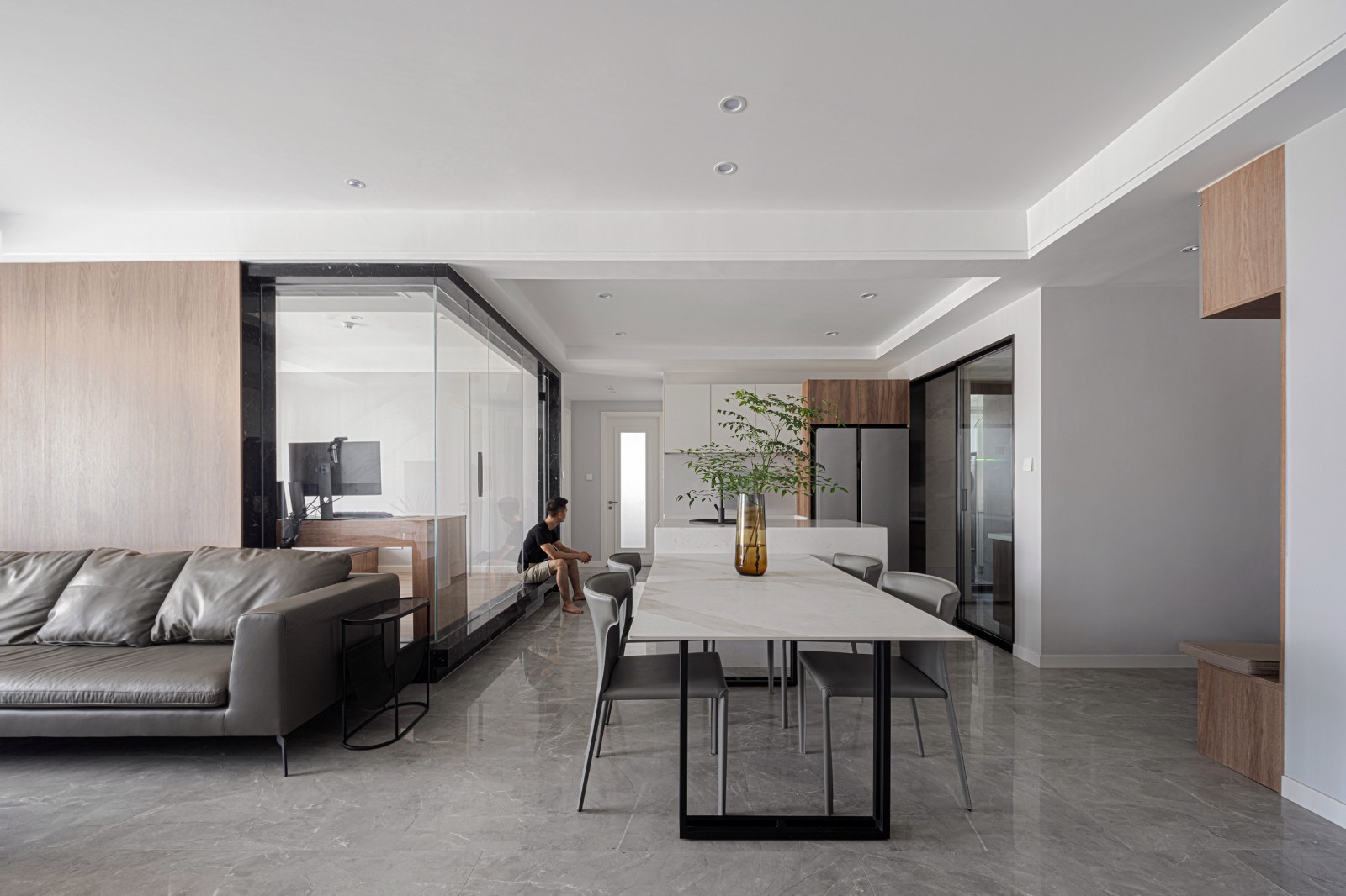 玻璃推拉门后是他们制作美食的中厨区域,白、灰、原木色依然是空间的基调,在充足光线的调和下,呈现出柔和且富有层次的美感。