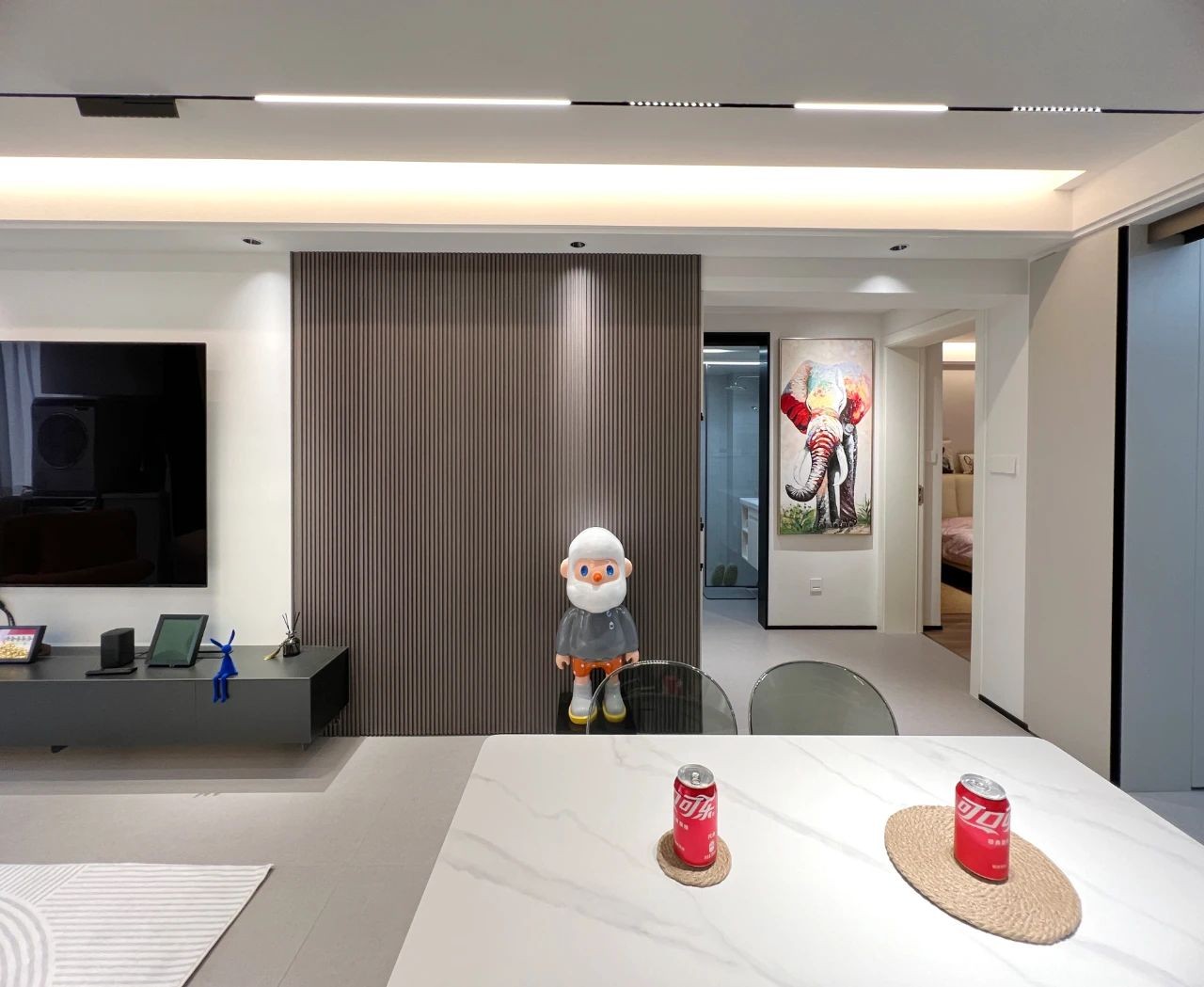 整体空间选用“无主灯”的设计,灯具全部选用磁吸轨道灯以及内嵌式筒灯,通过多种光源的组合搭配,营造不用的光影氛围,实现多种生活场景的灯光运用的可能性。