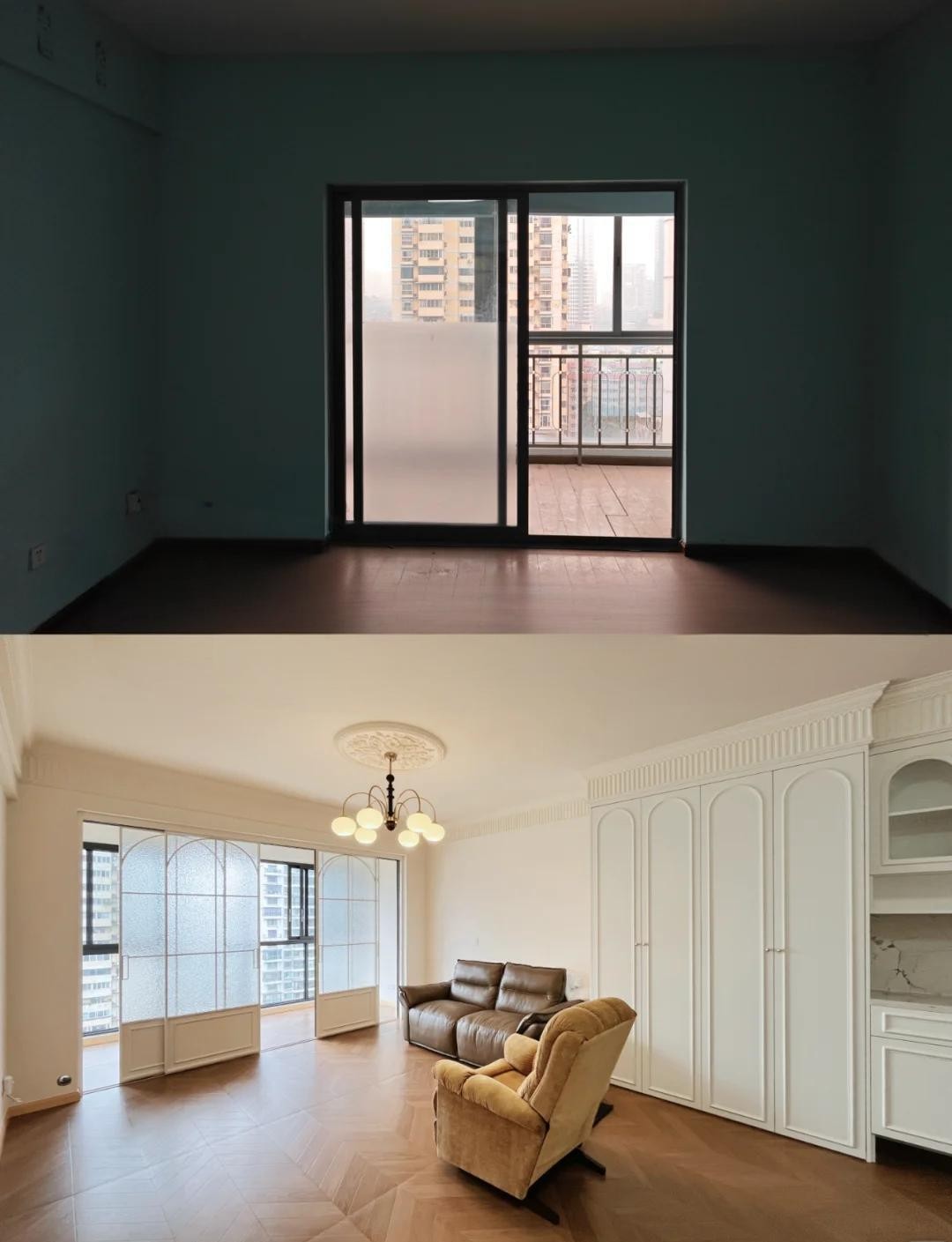 客厅、阳台 改前:光线昏暗,显得空间压抑,地砖老旧,推拉门严重挡光 改后:轻法式复古风狠狠拿捏住了