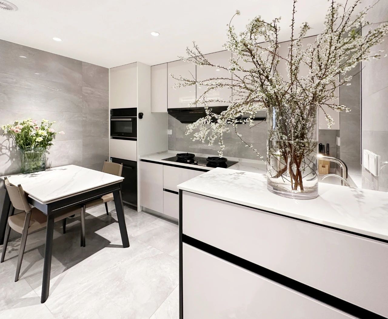 厨房纳入一组高质量橱柜,温柔的奶白色与***的黑色线条碰撞出极富质感的视觉效果,嵌入式的烤箱不占空间,很是实用。