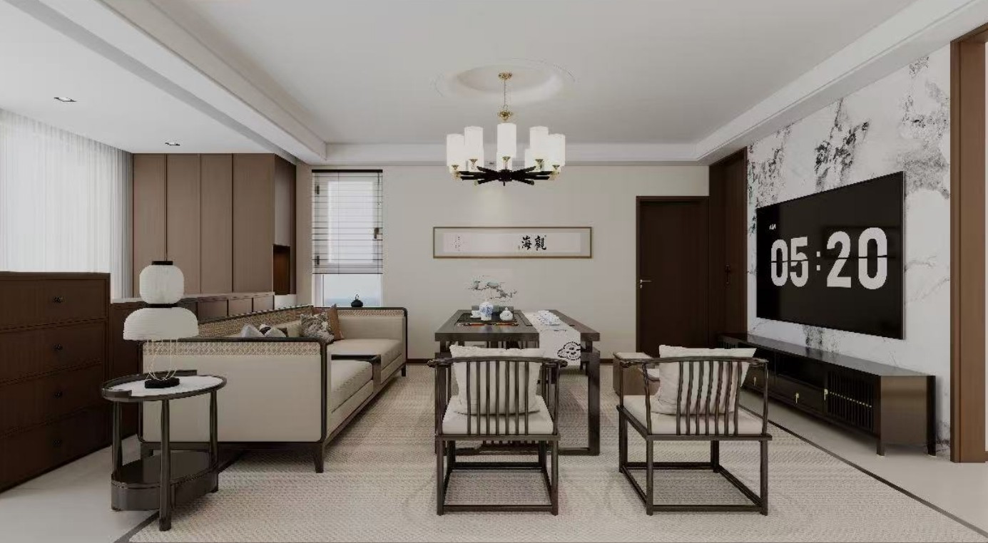 风格:整体采用现代中式风格,融合了传统中式元素与现代简约设计。 布局:空间布局合理,功能分区明确。沙发区、茶几区和电视区各自独立又相互协调。