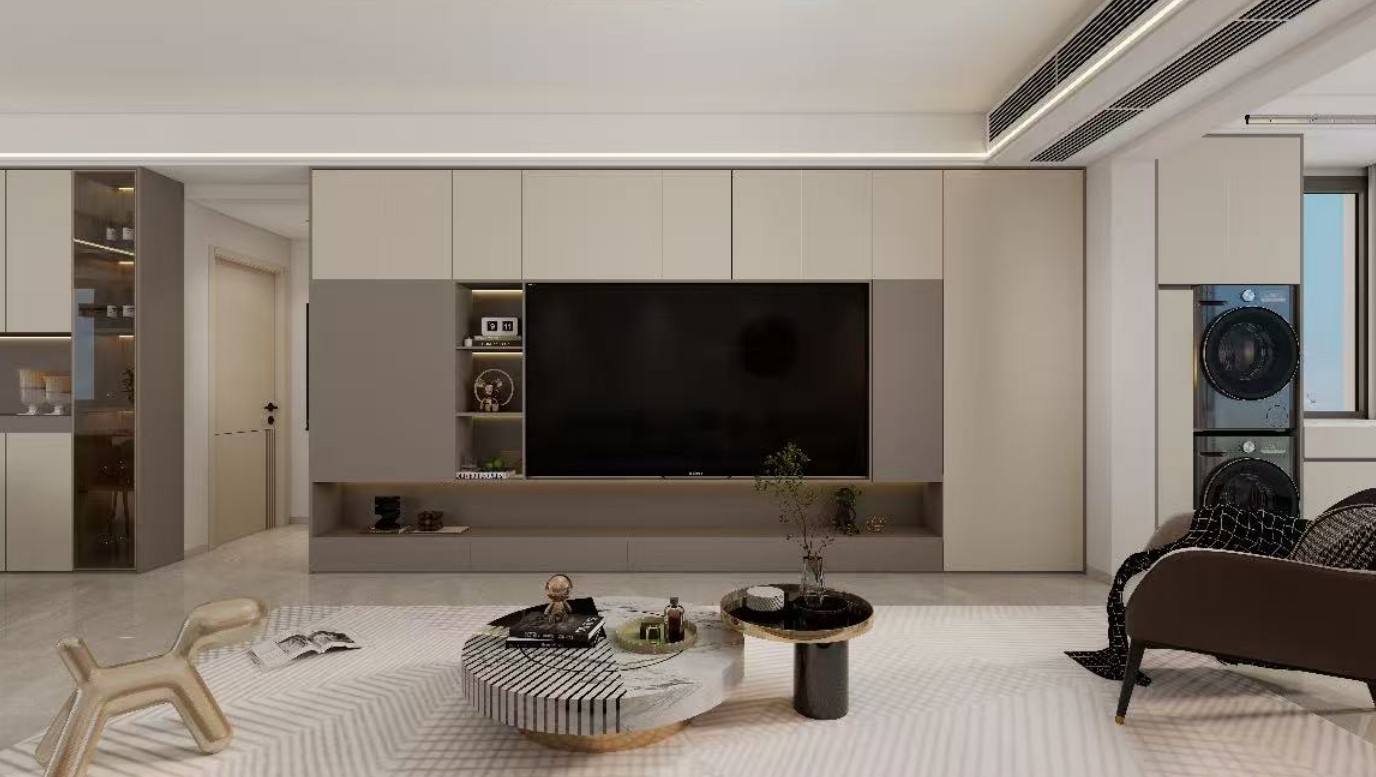 电视墙为嵌入式设计,电视嵌入墙体中央,两侧和上方为储物柜,提供充足的收纳空间。 储物柜采用无把手设计,整体感强,简洁大方。 电视墙下方设有开放式置物架,摆放装饰品和绿植,增加生活气息。