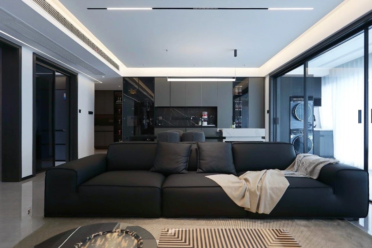 线条简洁的黑色沙发是客厅的视觉焦点,糅合周围设计的同时,让客厅更加具有现代感与层次感。