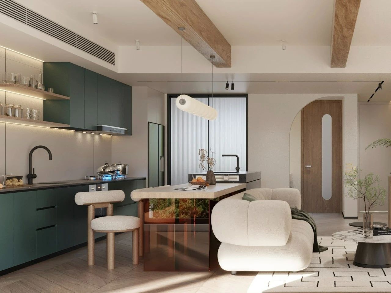设计师在平面的吊顶中增加原木梁设计,从而增加视觉起伏,让天花板更有立体感。原木的温润质感中和现代材料的冷硬感,营造 “自然侘寂” 或 “北欧乡村” 的氛围。