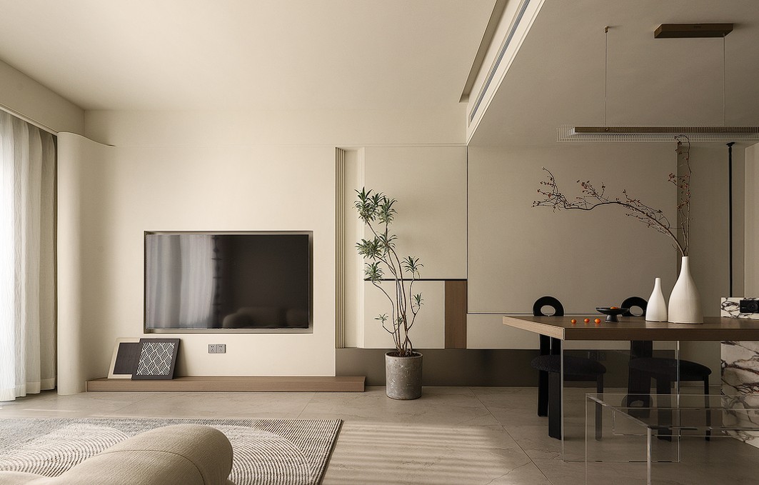 整个过道,利用公卫二次分离的卫生间外置洗手台,尽显空间尺度感,各私有空间的房门无框隐形到顶,将极简利落到更***。