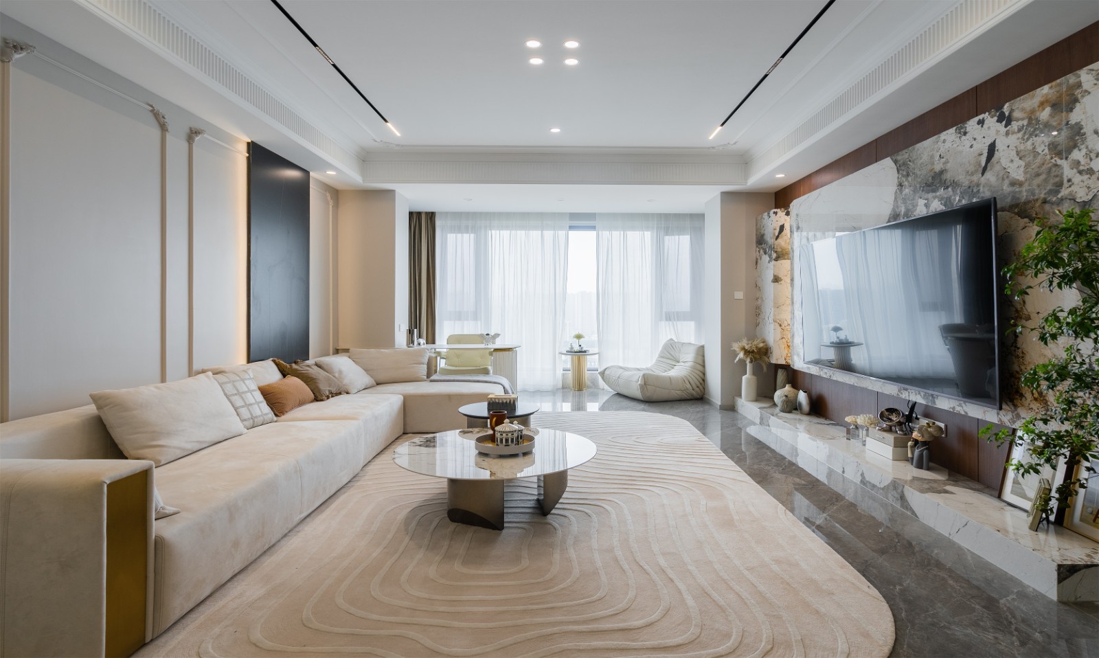 客厅还采用前沿的无主灯设计,搭配磁吸轨道灯与隐藏式灯带相互配合,既保证了均匀的光环境,又以悬浮式视觉效果强化了层高优势,将大平层的空间气度展现得淋漓尽致。