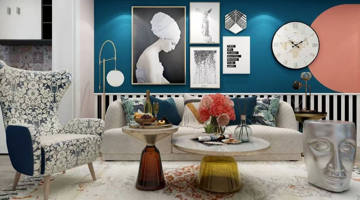 主色调:背景墙采用深邃的水手蓝(Prussian Blue),营造出一种宁静而深邃的氛围。 点缀色:右侧的珊瑚橘(Coral Peach)圆形装饰和家具上的暖色调(如花束的粉色、橙色)形成鲜明对比,增添活力与温暖感。