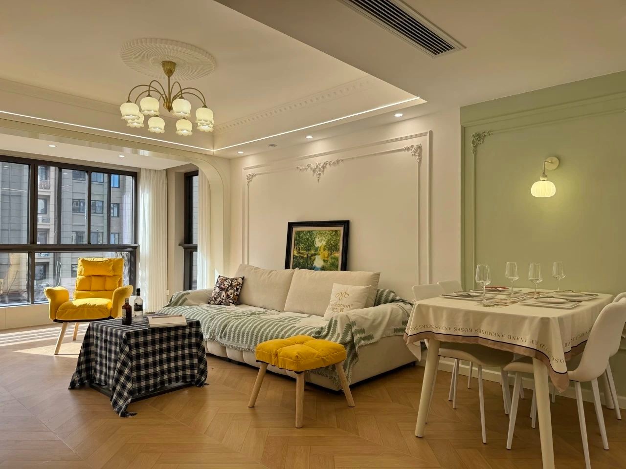 米白色沙发慵懒随性,搭着格纹毛毯,再配上一抹亮眼黄的单椅,尽显法式风情。大幅艺术挂画,为空间添文艺格调。