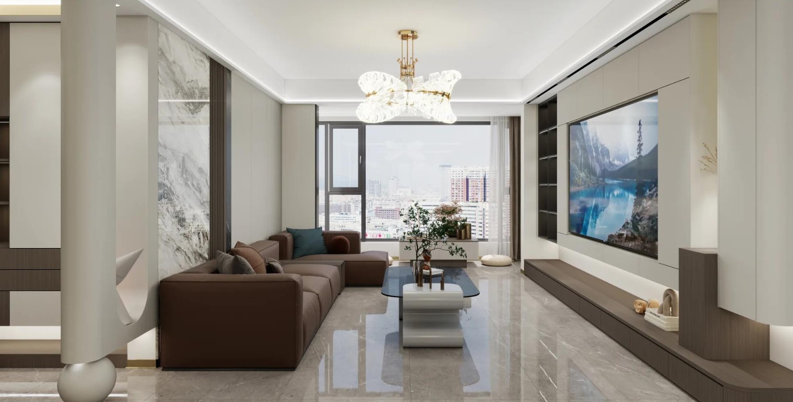 空间布局:采用开放式一体化布局,客餐厅与观景阳台联动,以沙发、电视墙为核心构建社交区,借落地窗引入城市景观,契合现代 “社交化、通透感” 需求。 硬装设计:墙面运用大理石饰面板(背景墙 ) 、肤感漆(浅色墙面 ) 拼接,顶面设悬浮吊顶 + 艺术吊灯 ,地面铺超大型通体大理石瓷砖 ,通过材质对比(温润皮质与冷冽石材 )、灯光层次(线性灯 + 主灯 )