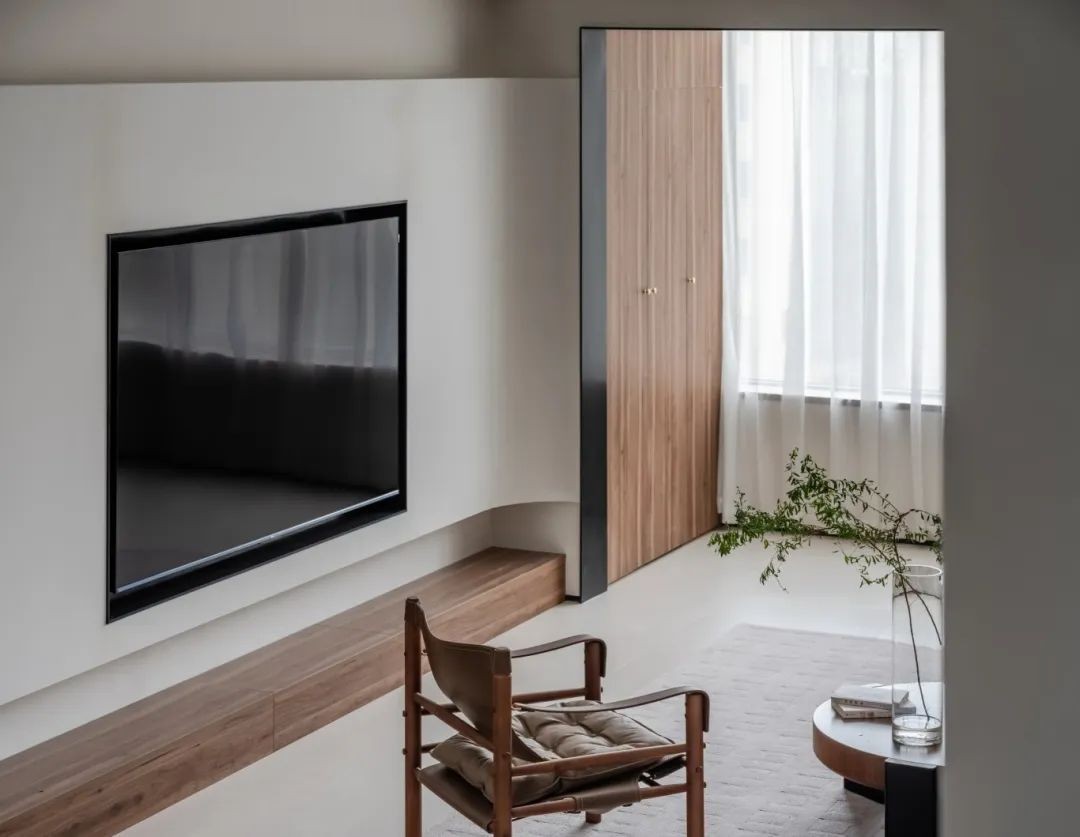 电视巧妙地镶嵌在墙面中,延伸至阳台墙垛的不锈钢收口处,流畅的弧度不仅拉伸了视觉效果,更让整体空间显得既简约而不失精致。