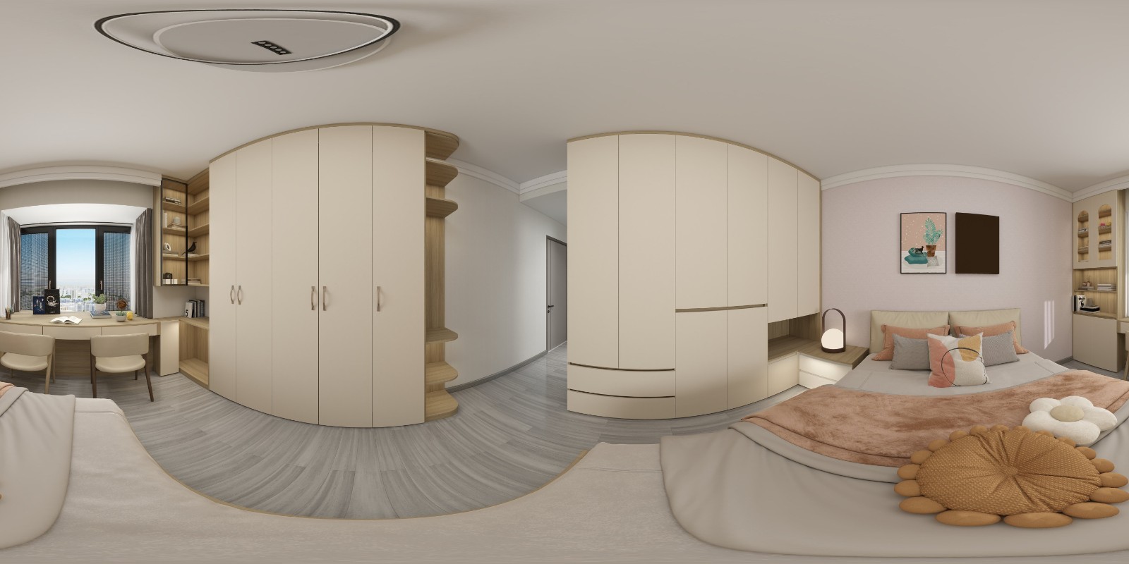 这张全景图展现了客餐厅一体化的设计。设计老师打破了传统的空间界限,让客厅和餐厅相互连通,增加了空间的互动性和通透感。在色彩搭配上,以浅色系为主,营造出温馨舒适的奶油风氛围。同时,通过不同材质和家具的搭配,区分了两个功能区,既保证了整体的协调性,又满足了各自的功能需求。这种设计充分考虑到客户对家庭互动和空间利用的需求,让家成为一个充满温馨和活力的地方。