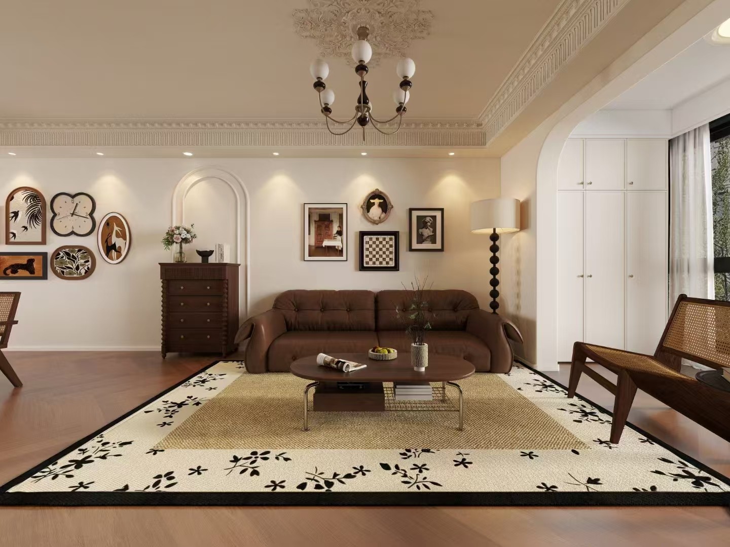 轻复古混搭风格突出。棕色皮质沙发、藤编座椅等复古家具,搭配造型经典的吊灯、装饰画,地毯的花纹呼应整体,营造温馨且具格调的休闲空间 。