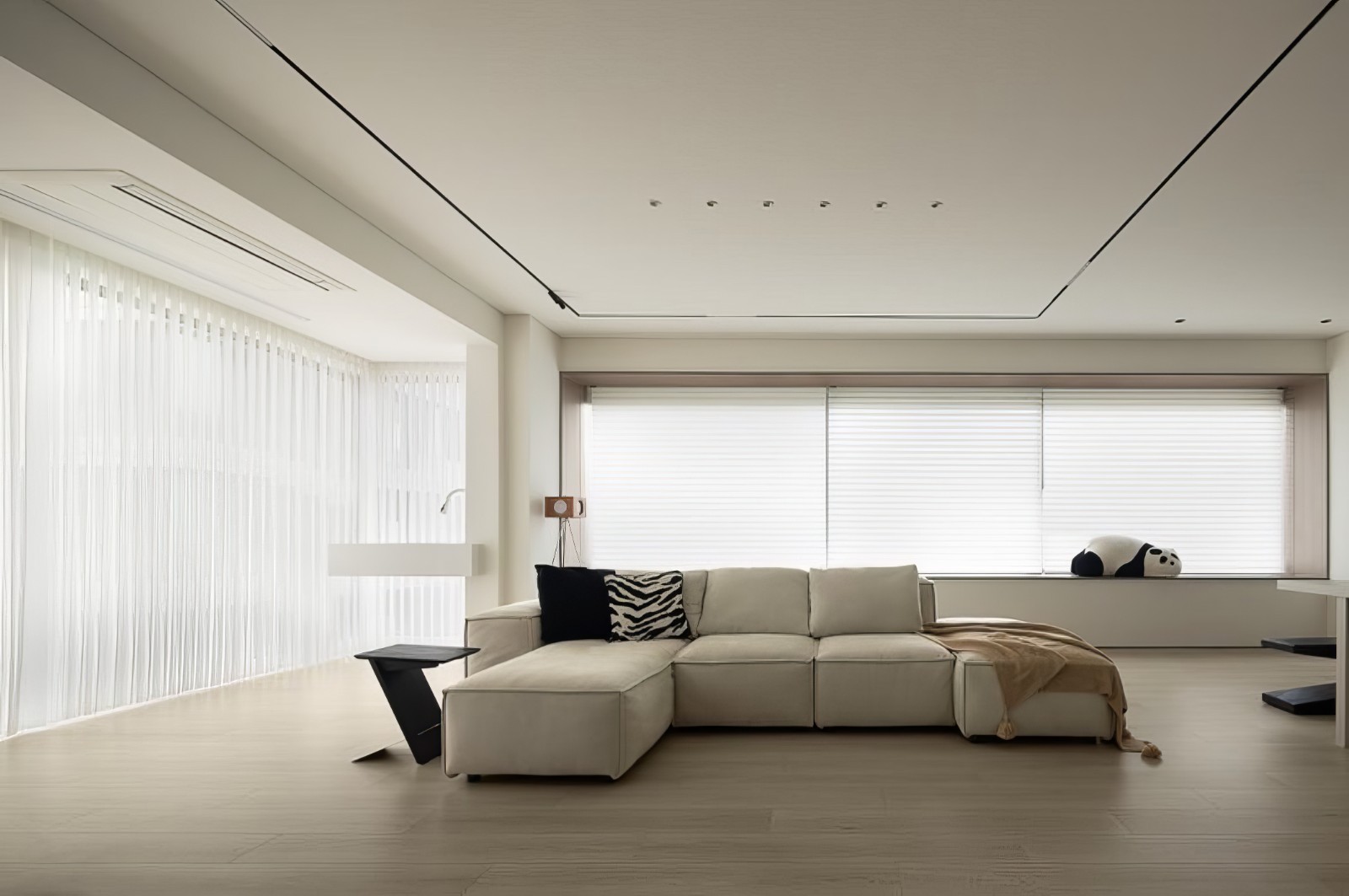 双面采光的大横厅,光线有时候不免过于强烈,右侧的超长大飘窗安装了香格里拉百叶窗,可以有效地调节光线,让光线更加柔和均匀。飘窗被整体包裹木饰面,设计为框景的形式,突出了窗的立体感,同时也呼应了地板的木色,让空间温馨而不繁杂。