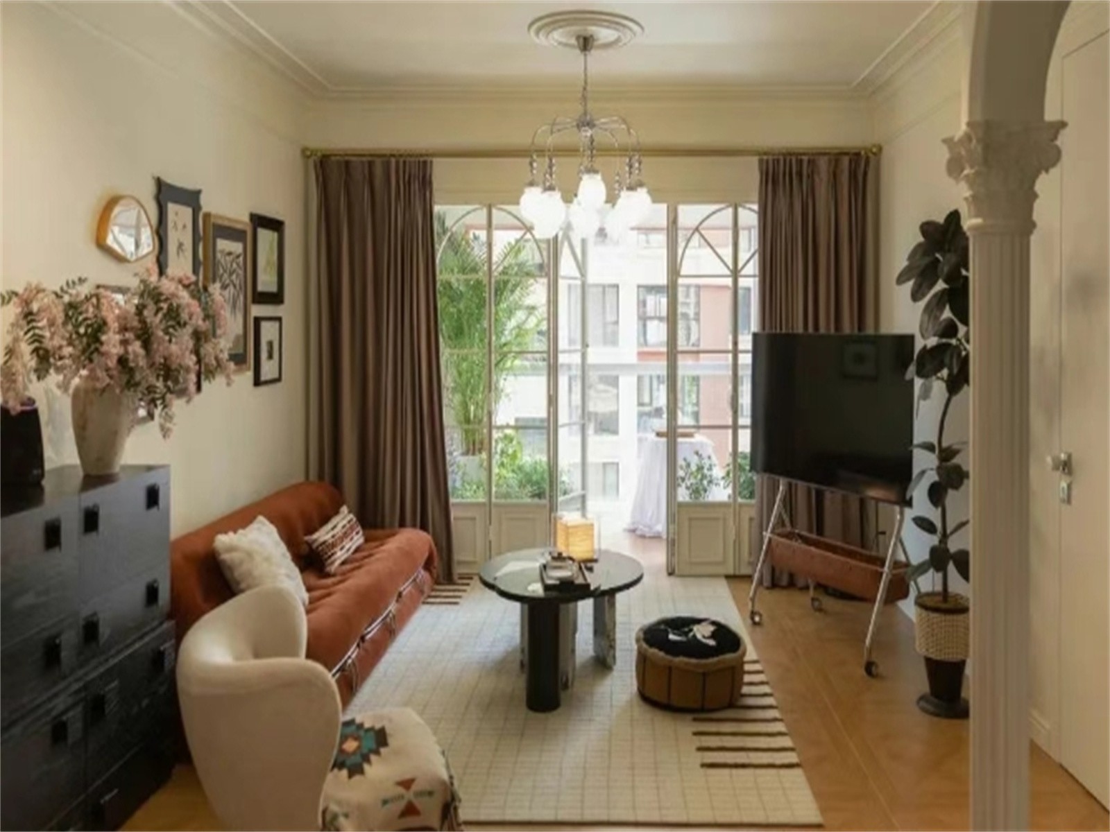 客厅与阳台相接之处安装法式玻璃折叠门,其造型以经典的法式弧形线条精心勾勒,奶白色调与玻璃完美交融,既确保了室内光线的自由流动,又将复古法式风情展现得淋漓尽致
