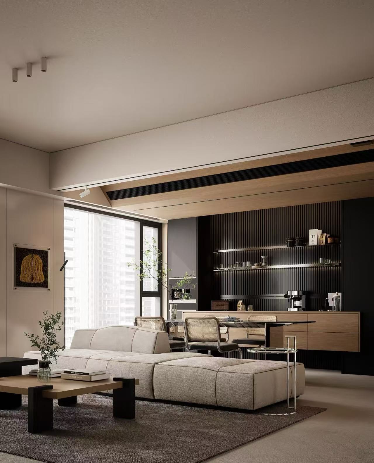 茶室与客厅融城视觉通廊,以梁为轴划分解决客厅的平面逻辑。