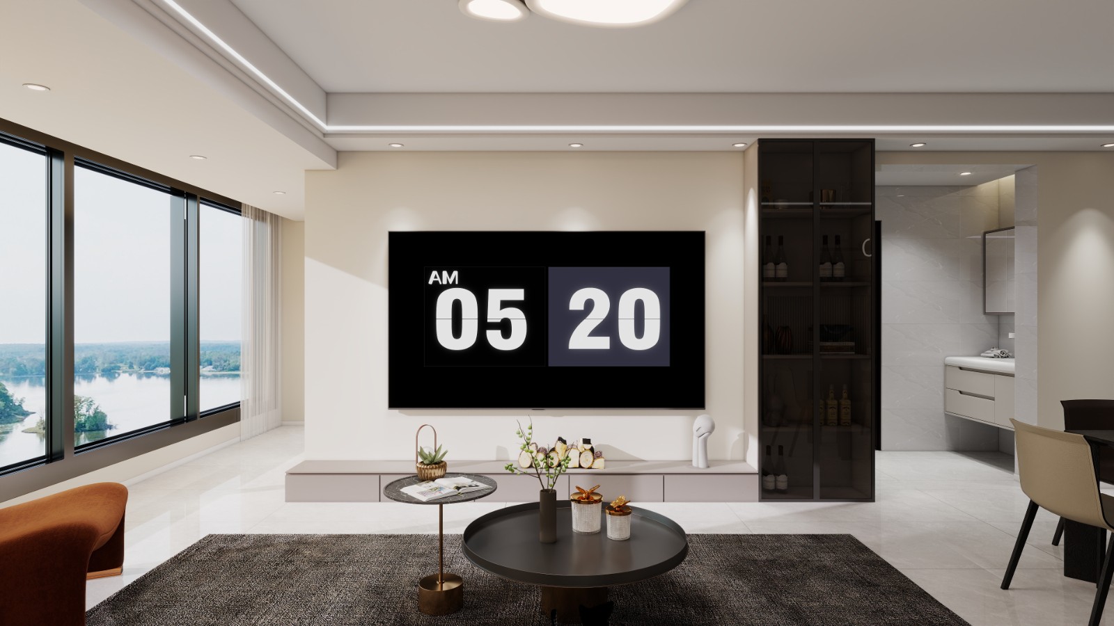 哑光黑岩板电视背景墙,通过不对称悬浮设计打破传统边界,与白色极简储物柜形成强烈视觉对冲,宛如现代艺术画作的立体呈现