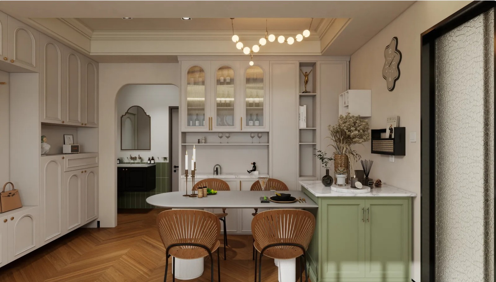 客厅及餐厅,其设计以清新风格为主,整体色调柔和。白色橱柜搭配浅绿色柜子,增添自然气息。餐桌为白色,搭配四把棕色编织椅。上方悬挂着简约的白色吊灯。墙面设置置物架,摆放摆件、花瓶等,既具装饰性又实用。背景处拱形门洞设计独特,与整体风格相呼应,营造出温馨且有格调的用餐空间。