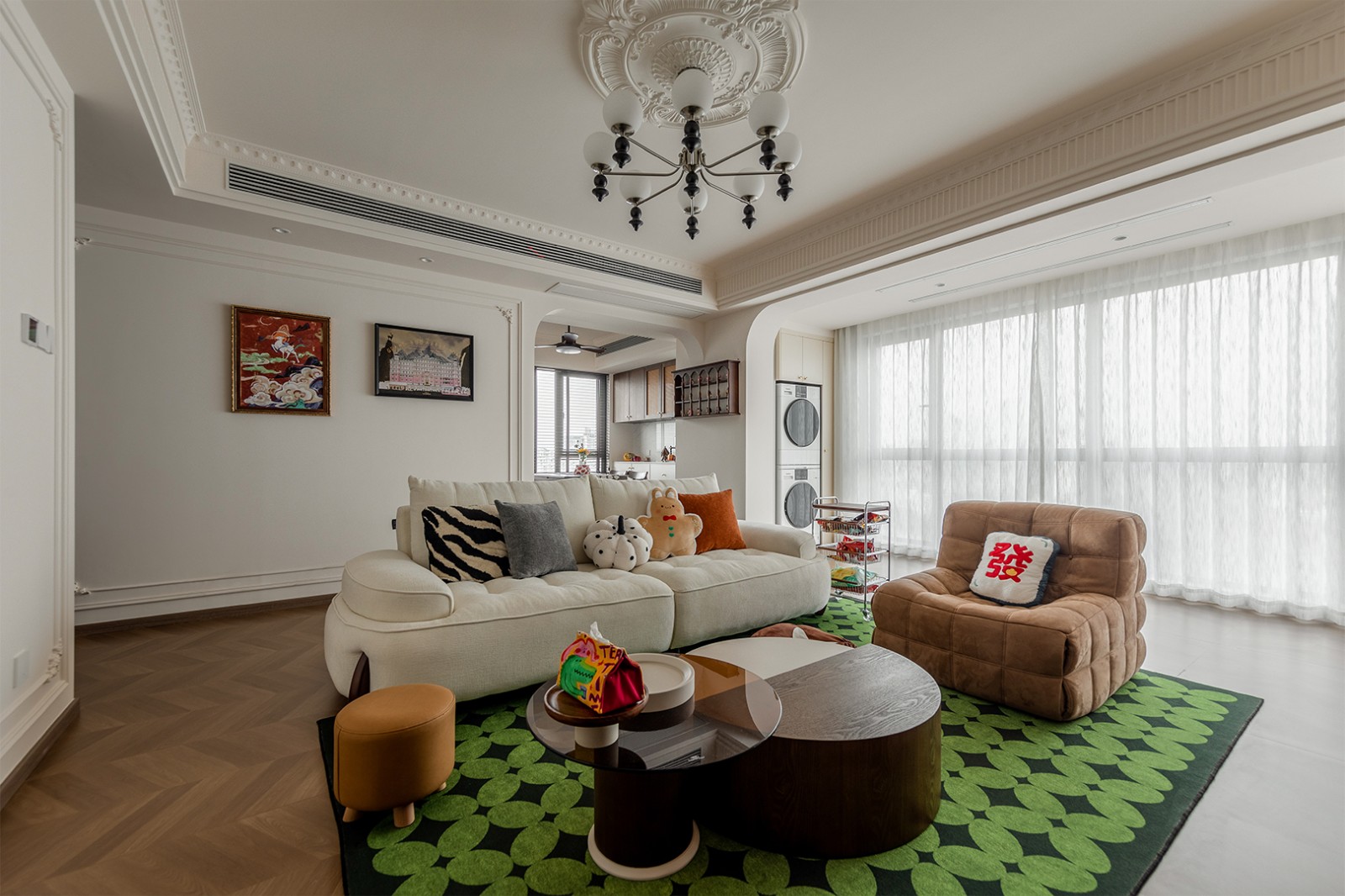 走进客厅,首先映入眼帘的是一套白加咖色的沙发,简约而不失优雅。沙发背景墙选择了淡雅的色调,与沙发色彩相呼应,营造出一种宁静舒适的氛围。搭配上古典的装饰画和精致的摆件,让整个客厅充满了艺术气息。